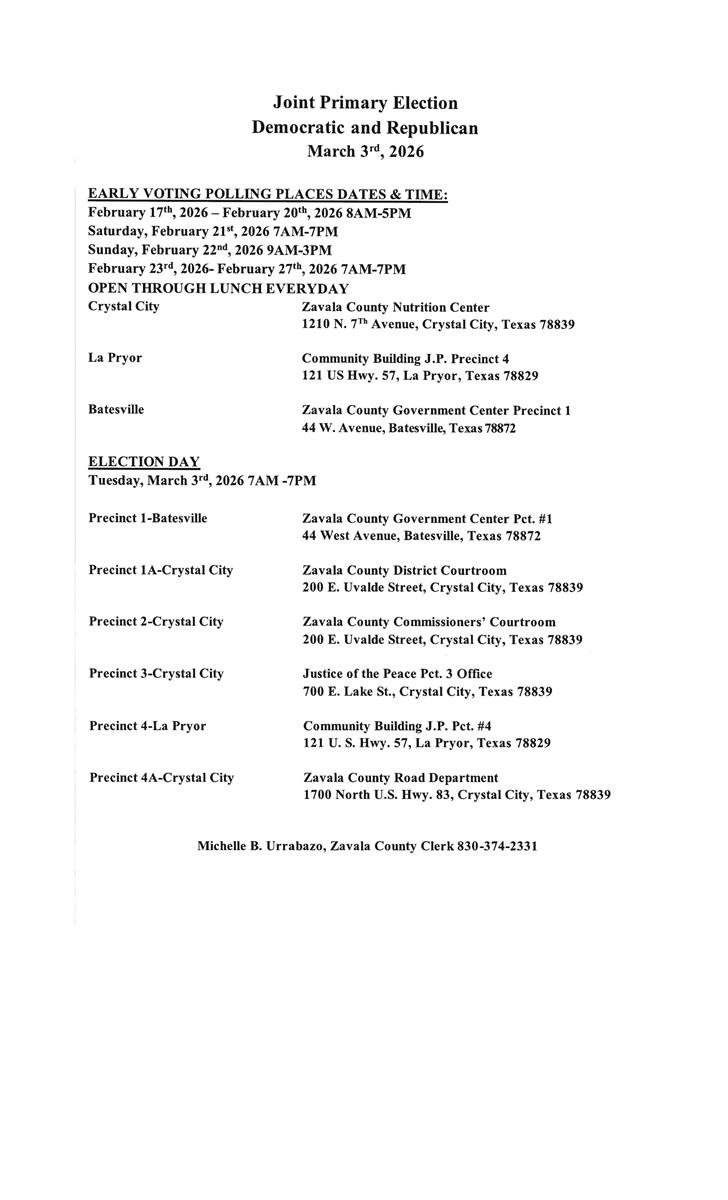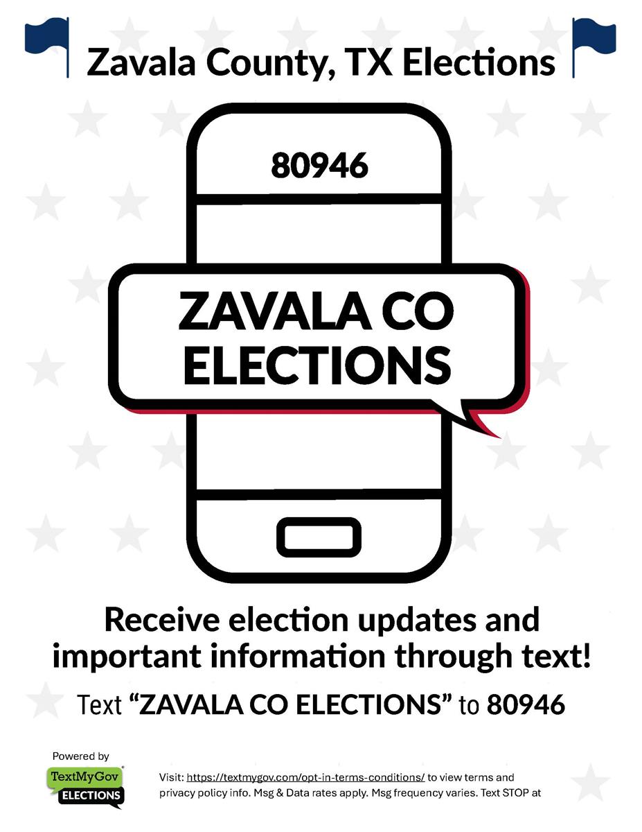 keyword “Zavala Co Elections” to the number 80946. After sending the initial keyword, you will be asked